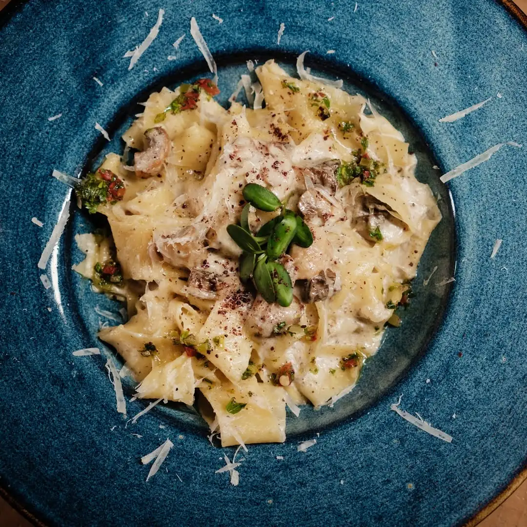 На горячее в Pablo предлагают индейку с тыквенным соусом и цукини — 29 руб., цыпленка на гриле с грибным соусом — 19 руб. и пасту с белыми грибами и трюфелем — 29 руб.