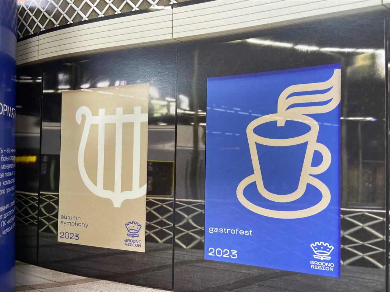 Фирменными цветами стали золотой, синий и белый. А в паттерне — узоре, заложены элементы гербов районов Гродненской области. В качестве слогана выбрали фразу «Grodno Region — территория комфортного туризма».