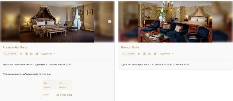 Также есть немного вариантов на другие даты. Например, с 3 по 6 января 2026 года можно забронировать Deluxe Suite за 3 780 BYN на три ночи на двоих или Standard Room за 3 240 рублей за тот же период.