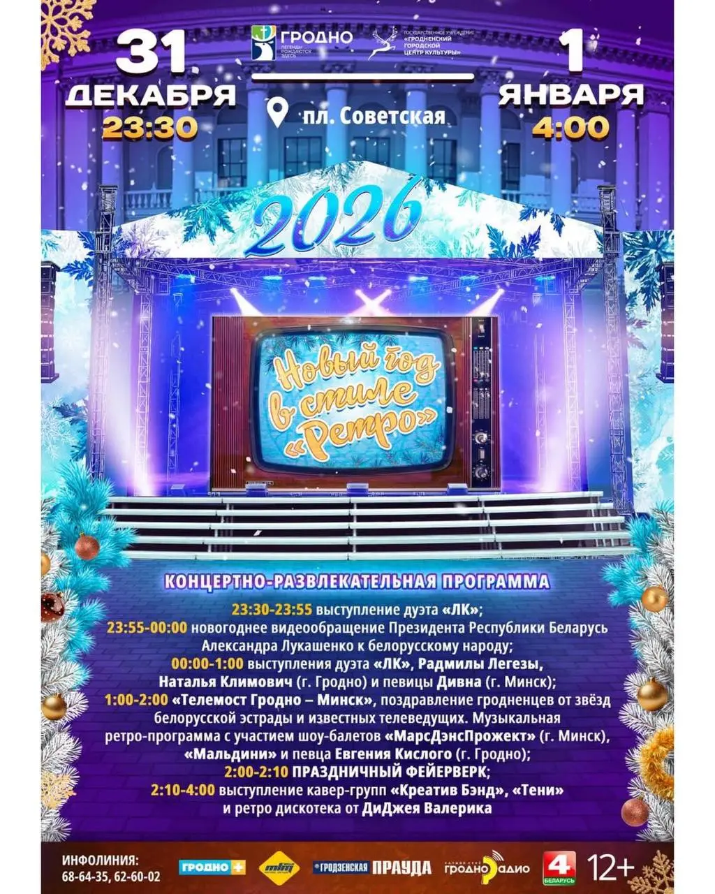 Городские празднования Нового года начнутся в Гродно 31 декабря в 23:30. Основные мероприятия пройдут на Советской площади.