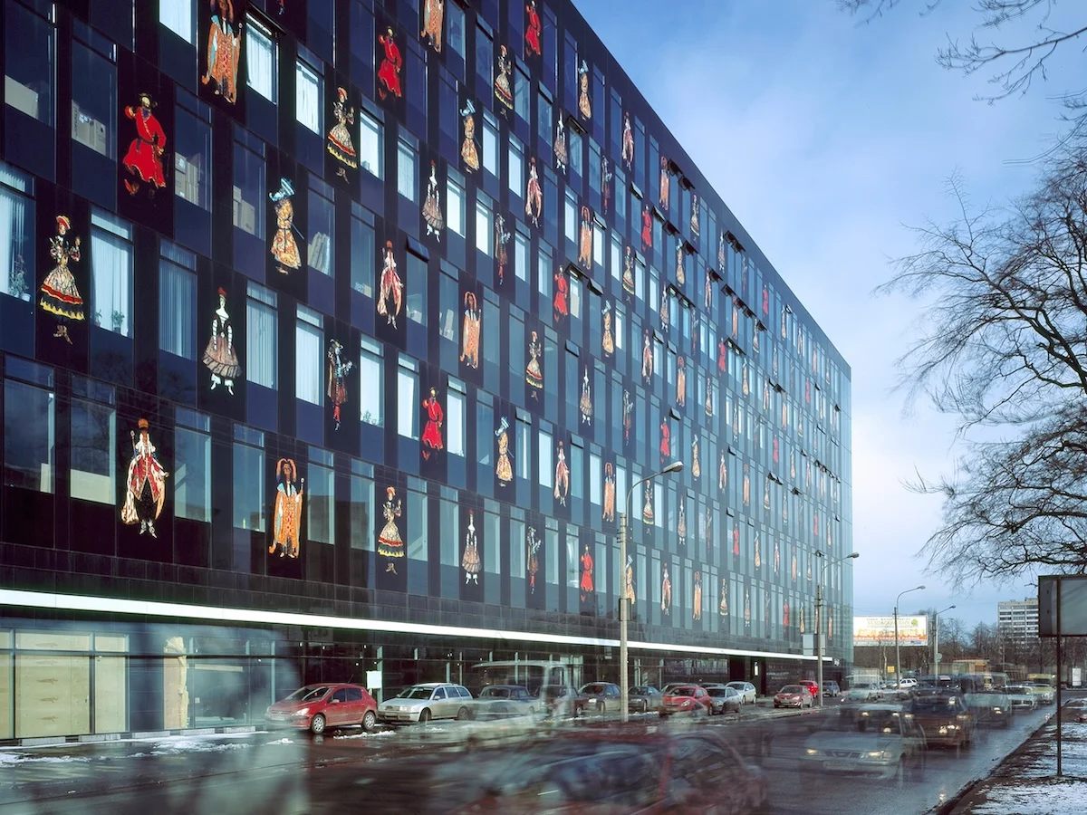 Бывшие промышленные здания в Петербурге реконструировали иначе. Там оставили каркасы, но сделали совсем новые фасады и достроили этажи. Это уже ближе к подходу Семашко, но есть нюанс. Фасады остались плоскими и стеклянными, а декор “под старину” в первом случае и репродукции фрагментов картин во втором нарисованы на стекле методом шелкографии. С гродненским Домом быта бывший цех, а ныне БЦ “Лангензипен” роднит еще и расположение — вдали от улицы, за деревьями и другими зданиями.