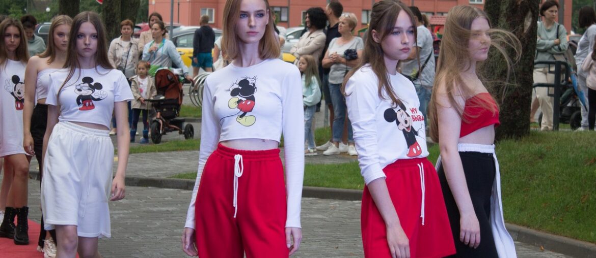Следующий выход моделей — в одежде от дизайнерки Юлии Траскевич. Первая её коллекция, «Микки» посвящена любимому герою мультфильма из детства. Большая часть одежды в этой коллекции из хлопка и трикотажа.