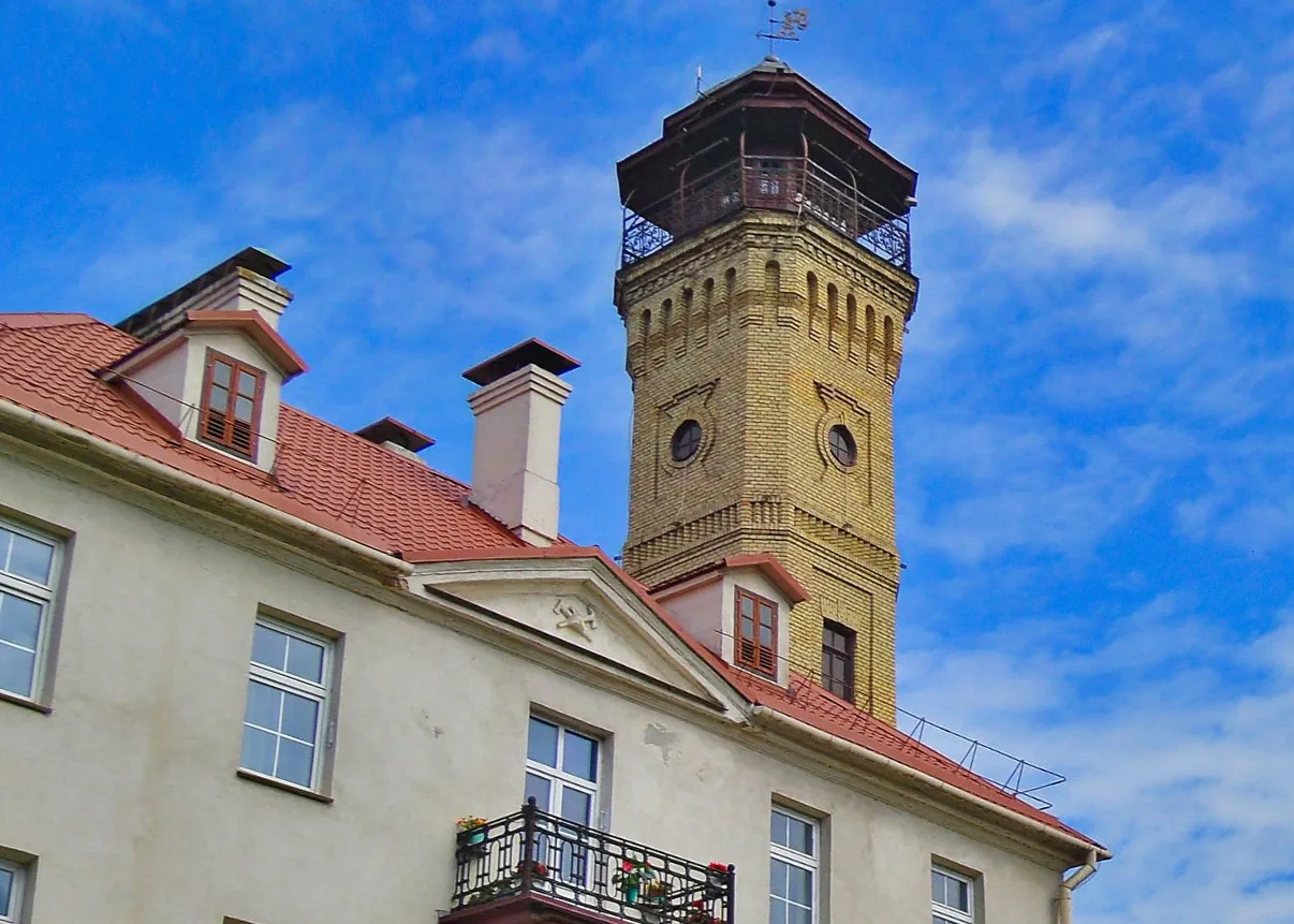 На фронтоне здания пожарного депо по улице Замковой, 19 расположен барельеф каски и двух топоров.