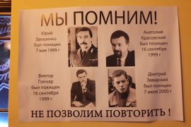 Вечером 16 сентября на улице Советской появился большой плакат с портретами похищенных и пропавших без вести политиков Виктора Гончара и Юрия Захаренко, бизнесмена Анатолия…