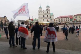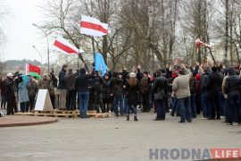 Несколько человек с флагами ОГП, БХД и бело-красно-белым флагом собрались в воскресенье 19 февраля в 14.00 на ступеньках дворца культуры текстильщиков. Они кричали «Жыве Беларусь»…