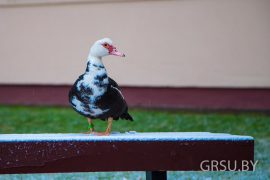 Гродненский орнитолог Дмитрий Винчевский говорит, что это мускусная утка, родом из Южной Америки. Она могла убежать от хозяина. Об этом свидетельствует лента на лапе…